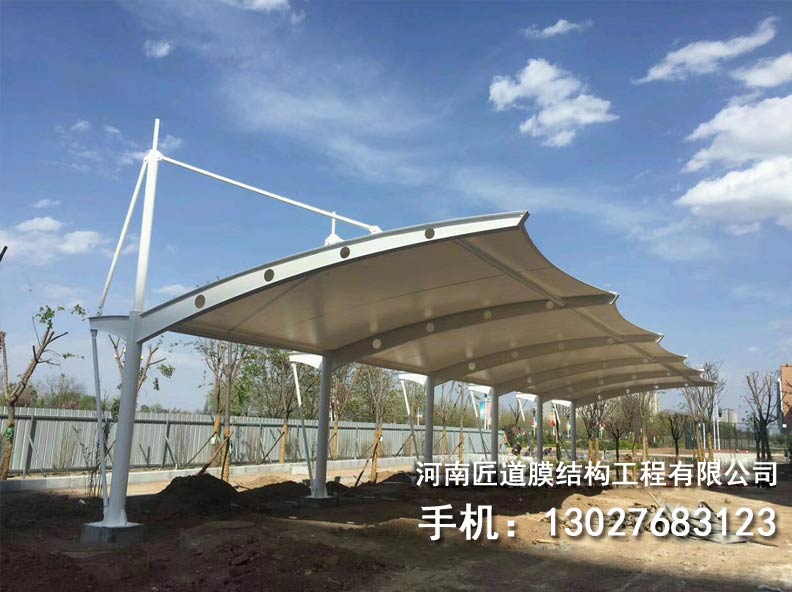 1、膜結構車棚的篷布材質是PVC、PVDF、PTFE聚酯類,而膜材的特點是強度高、耐久性好、防火難燃、自潔性好,不受紫外線影響,使用壽命長,一般15-30年。